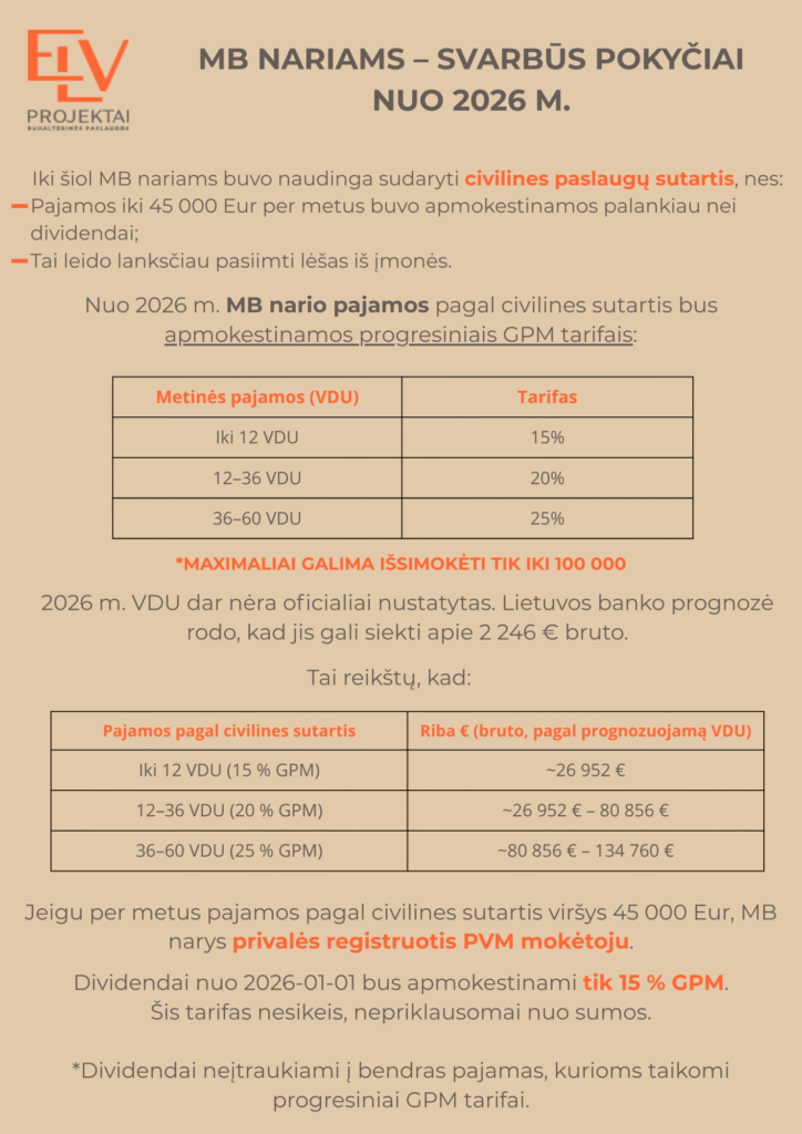 Jeigu per metus pajamos pagal civilines sutartis viršys 45 000 Eur, MB narys privalės registruotis PVM mokėtoju.