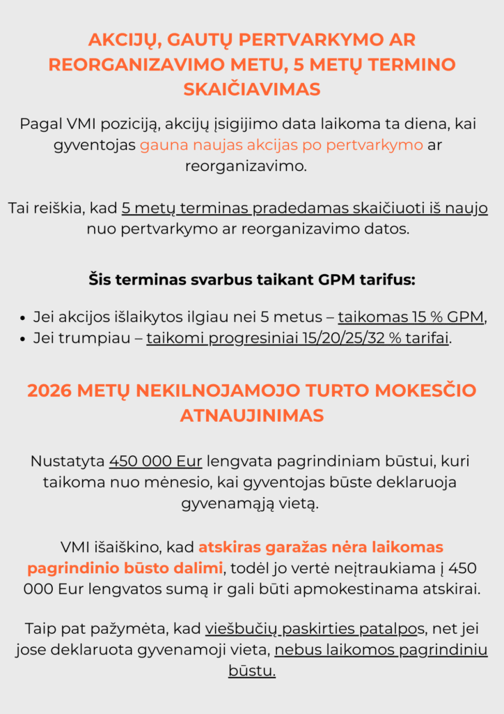 Pagal VMI poziciją, akcijų įsigijimo data laikoma ta diena, kai gyventojas gauna naujas akcijas po pertvarkymo ar reorganizavimo.