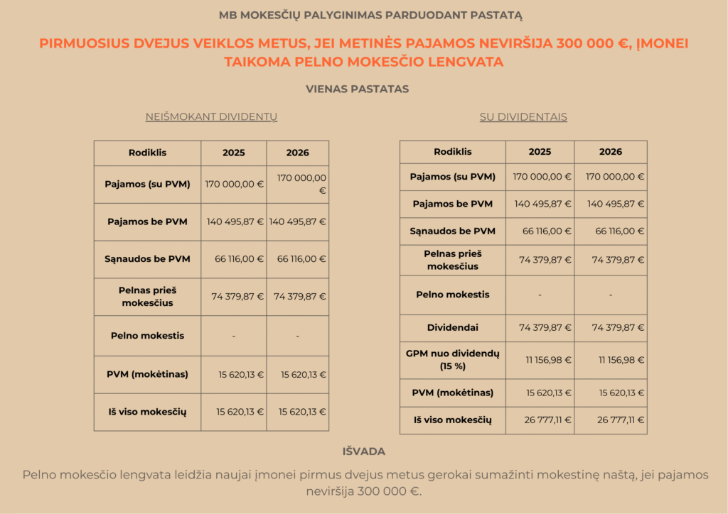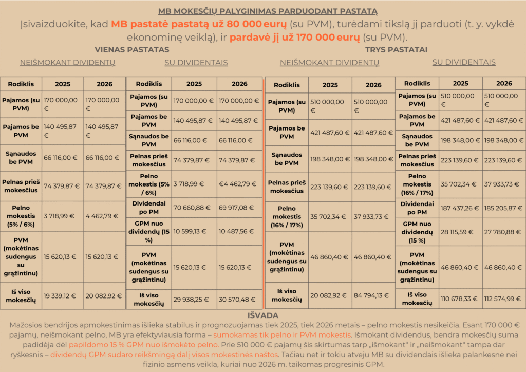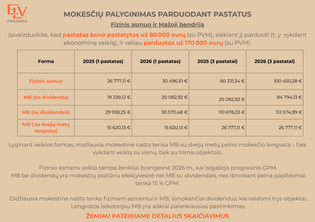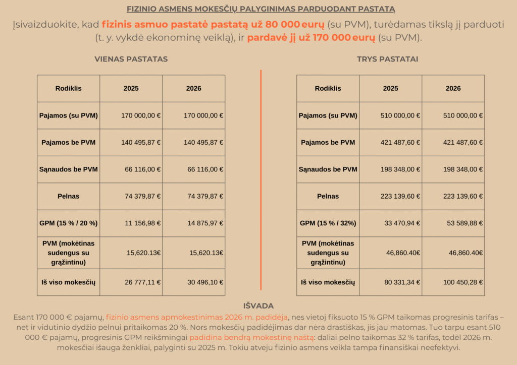 Įsivaizduokite, kad pastatas buvo pastatytas už 80 000 eurų (su PVM), siekiant jį parduoti (t. y. vykdant ekonominę veiklą), ir vėliau parduotas už 170 000 eurų (su PVM).