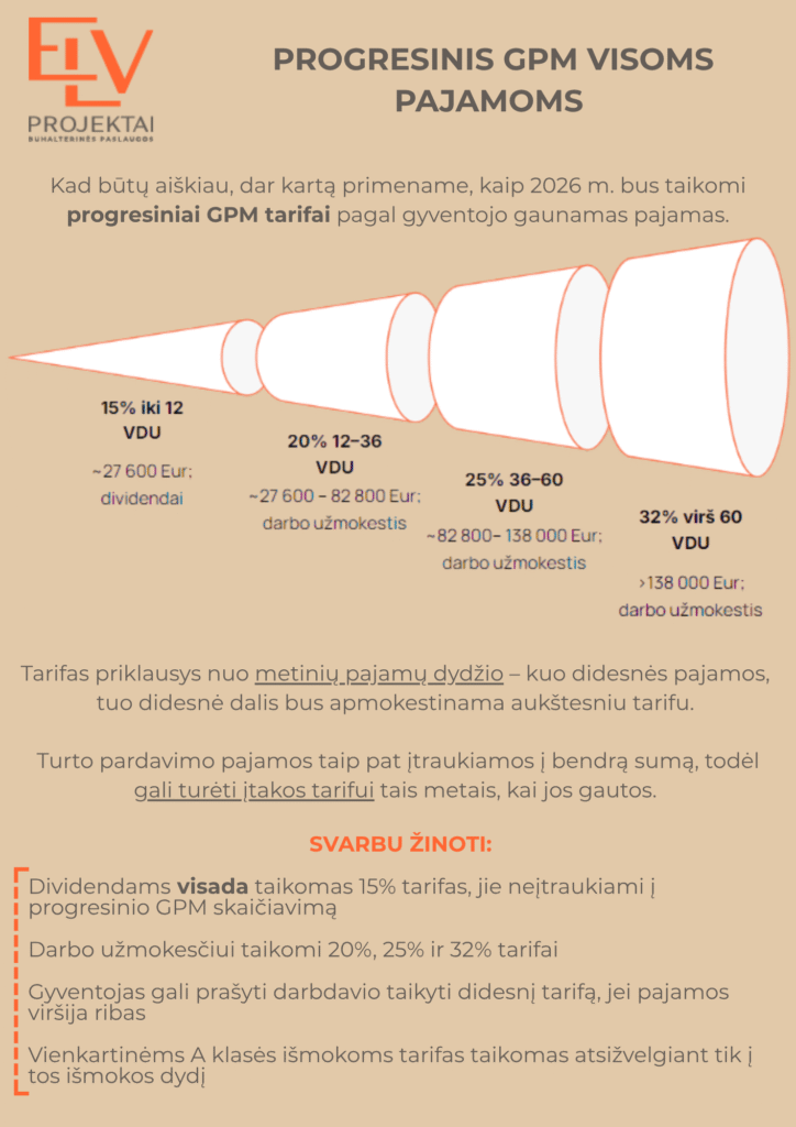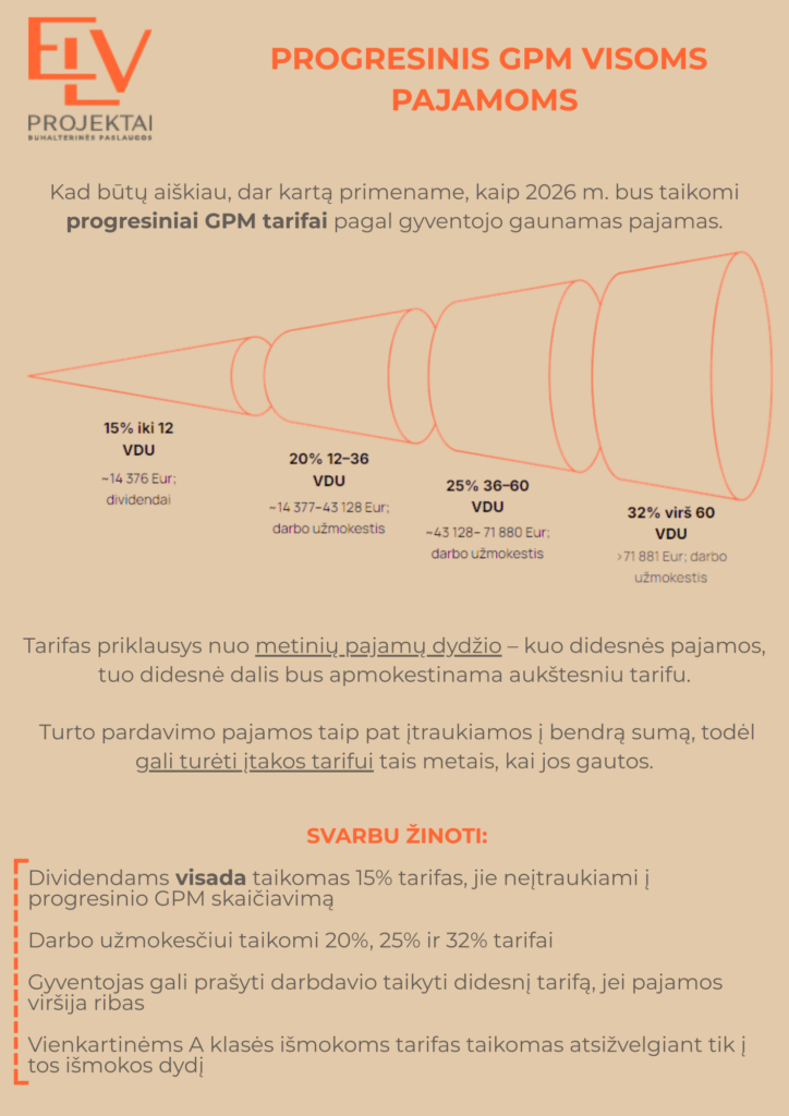 Kad būtų aiškiau, dar kartą primename, kaip 2026 m. bus taikomi progresiniai GPM tarifai pagal gyventojo gaunamas pajamas.