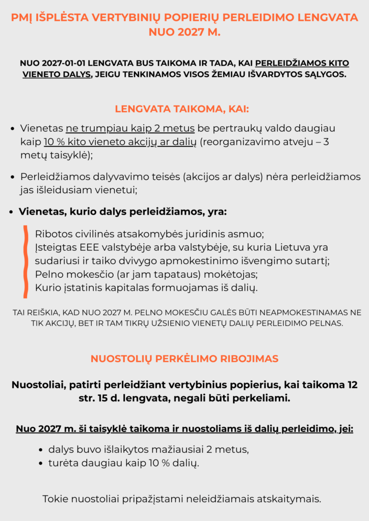 Nuo 2027-01-01 lengvata bus taikoma ir tada, kai perleidžiamos kito vieneto dalys, jeigu tenkinamos visos žemiau išvardytos sąlygos.
